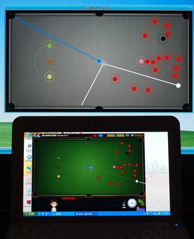 打球的时候按F1或者在球桌上点右键,A电脑上的影子窗口就会显示出瞄准线路了。