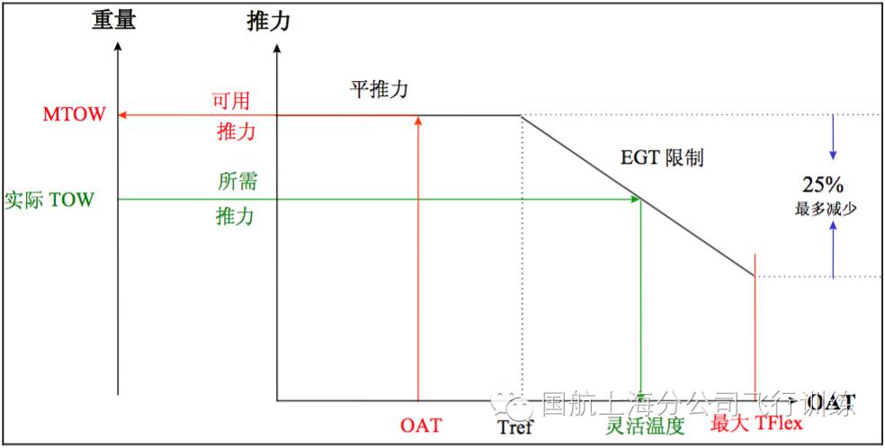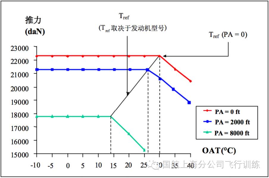 起飞推力的限制,发动机限制的主要原因是排气温度(EGT)的限制。起飞推力(TOGA)表示的是起飞的最大可用推力。在给定的气压高度上,当温度低于基准温度(Tref)或平推力温度时,它对发动机的起飞推力没有影响。高于基准温度,发动机的推力受到排气温度(EGT)的限制,可用推力随温度上升而减小。另一方面,在给定的温度下,气压高度的增加将导致可用起飞推力的降低。