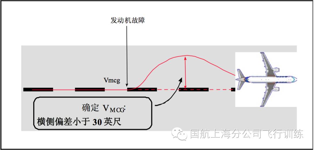 VMCG,地面最小控制速度:在这个速度,当关键发动机突然不工作时,仅靠主要空气动力控制就可以对飞机保持控制(不用前轮转弯),使用正常驾驶技术就可以安全起飞。假设飞机的加速航迹是沿着跑道中心线的,从一台关键发动机不工作开始时到方向恢复到与跑道中心线平行,横侧偏离跑道中心线的距离在任何一个点都不超过30英尺。