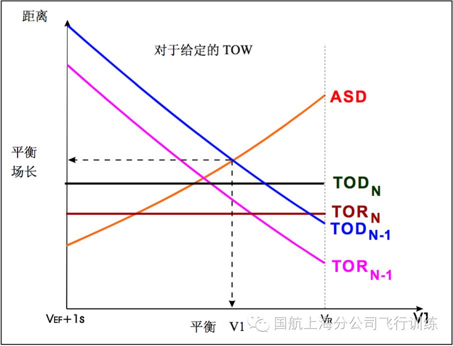 平衡V1与平衡场长,平衡场长是指在一发失效时按继续起飞距离和中断起飞距离相等条件所确定的长度。如果在某一重量下,一发失效于V1时刻决断作于中断起飞,按规定操纵飞机在停止所需的加速—停止距离,与V1时刻决断做继续起飞所需的起飞距离相等,且都等于可用的跑道长度,则此长度称为“平衡场长”,此时的全重就是一发失效情况下场地长度限制的最大起飞重量,所用的V1则称为“平衡V1”。通常加速到平衡V1要用掉大约60%的可用跑道长度,余下的大约40%供中断起飞或继续起飞使用。 对于给定的起飞重量,V1的任何增加都会导致TODN-1和TORN-1减小。这是因为当V1速度较大时,全发加速的阶段要长些,因此,当发动机在VEF发生故障时,以较短的距离在35英尺高度上就可以达到相同的V2速度。另一方面,由于没有发动机故障,TODN和TORN与V1无关,这样,对加速阶段和达到35英尺所需的距离就没有影响。相反,对于给定的起飞重量,V1的任何增加都会导致ASDN-1和ASDN的增加。这是因为当V1速度较大时,从松刹车到V1的加速航段要长些,从V1到全停的减速航段也要长些,而且以恒定V1运动2秒的航段也要长些。根据以上理论,可以画出TOD/ASD与V1的函数关系图:
