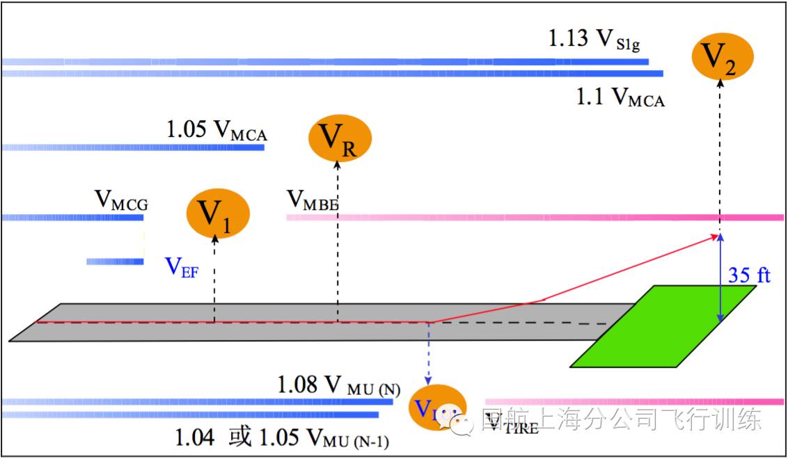 速度小结,下图解释了取证速度(VS1G,VMCG,VMCA,VMU,VMBE,VTIRE)和起飞操作速度(V1,VR,VLOF,V2)之间的关系和规章方面的余度。