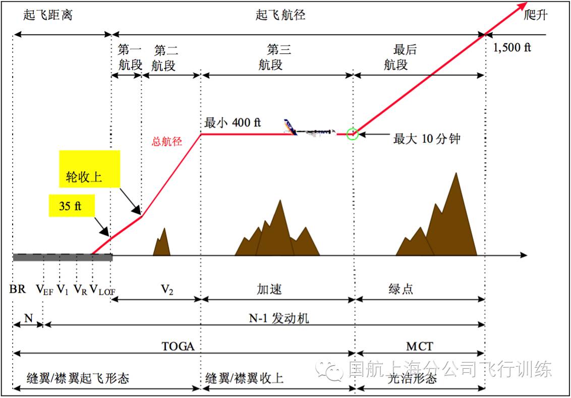 起飞航迹:从起飞距离结束后高于起飞表面35ft处开始延伸到飞机达到以下高度的点:高于起飞表面1500ft或从起飞到入航的形态转变已完成且已达到最后起飞速度,两者之间取较高者。起飞航迹可以被划分为图示的几个航段。